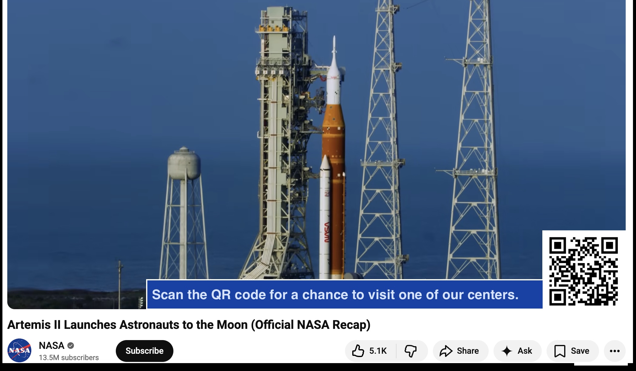 NASA broadcast: QR code + call-to-action bar in the bottom-right corner of the video frame